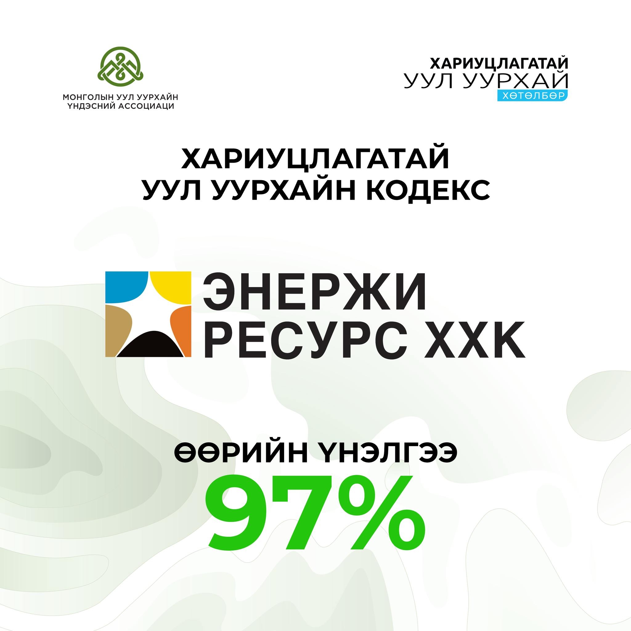 Монголын Уул Уурхайн Ассоциацийн хэрэгжүүлдэг “Хариуцлагатай уул уурхайн кодекс”-ын 2025 оны өөрийн үнэлгээгээр Энержи ресурс ХХК 97 хувийн үнэлгээ авлаа.